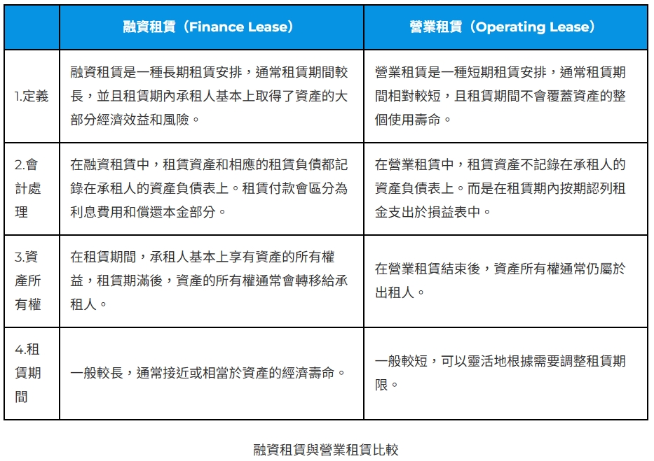 以下彙整融資租賃與營業租賃之比較。